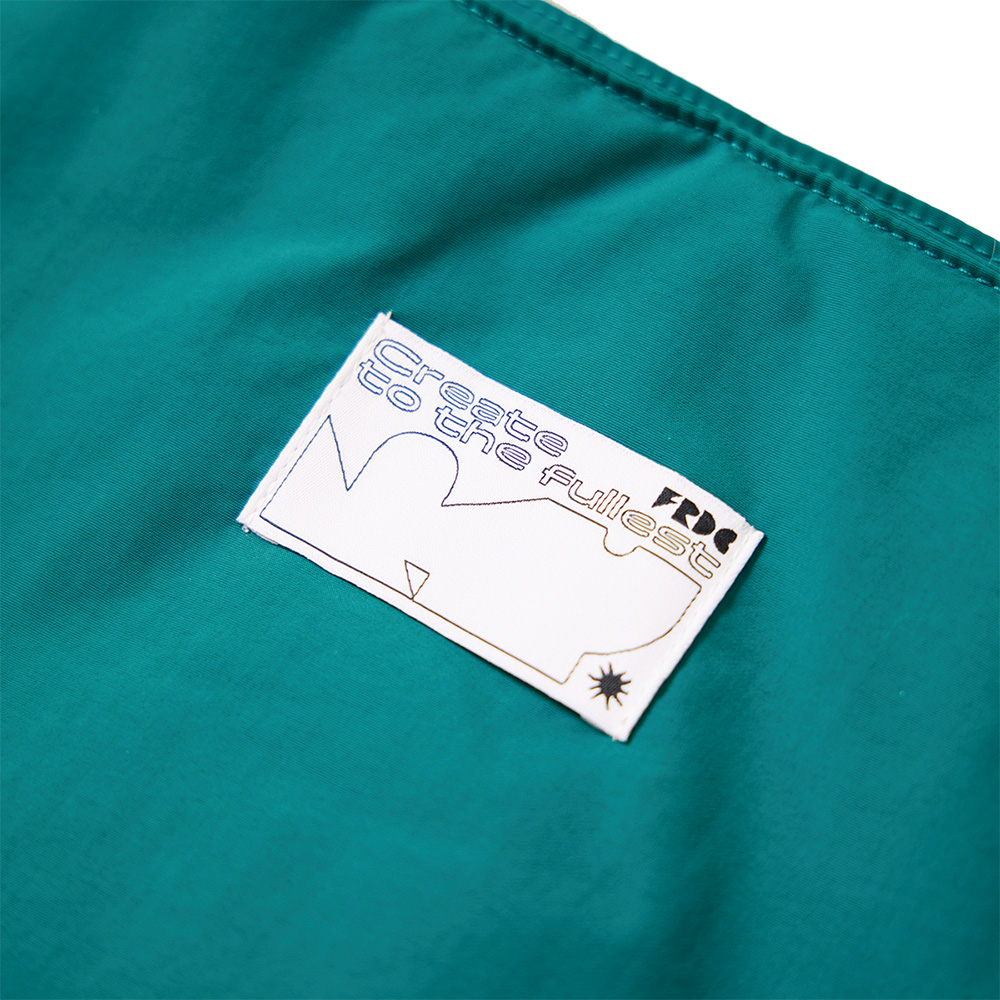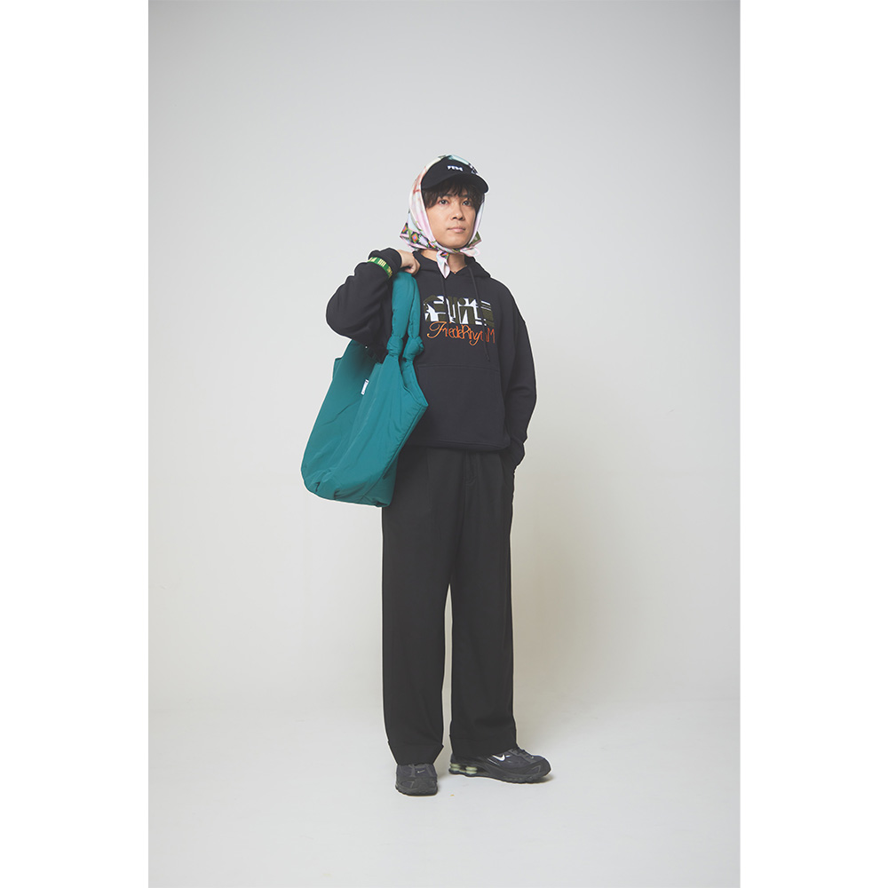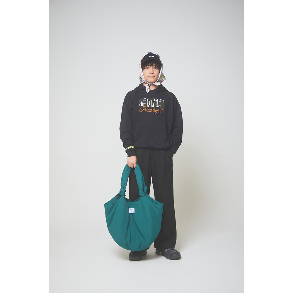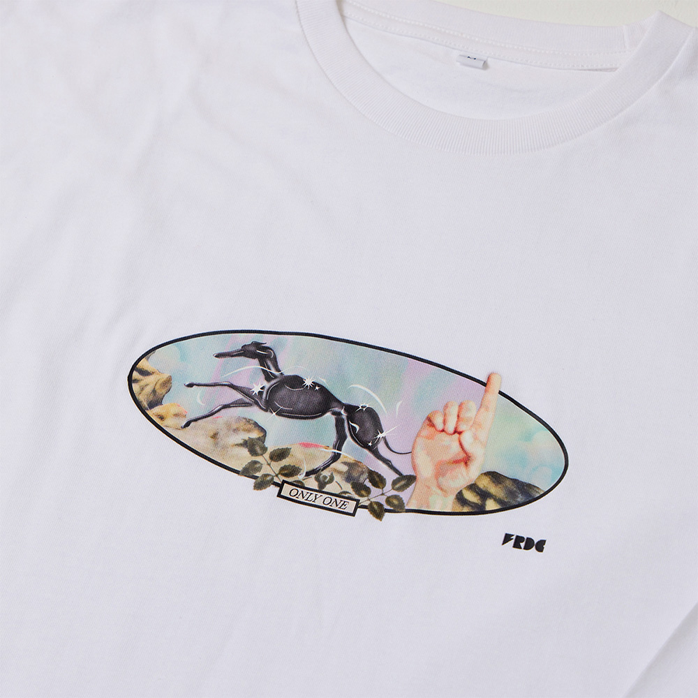 表の刺繍と重なったFRDCのバッグプリントが特徴のTシャツ