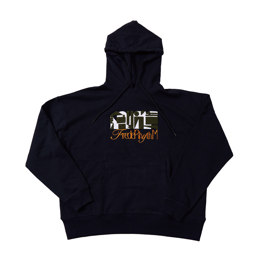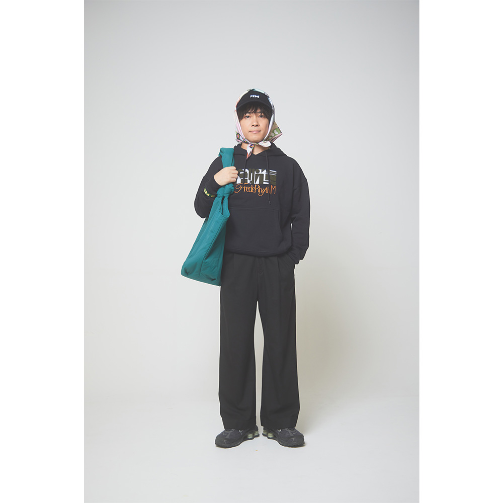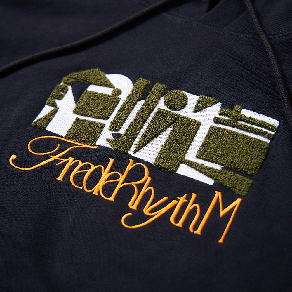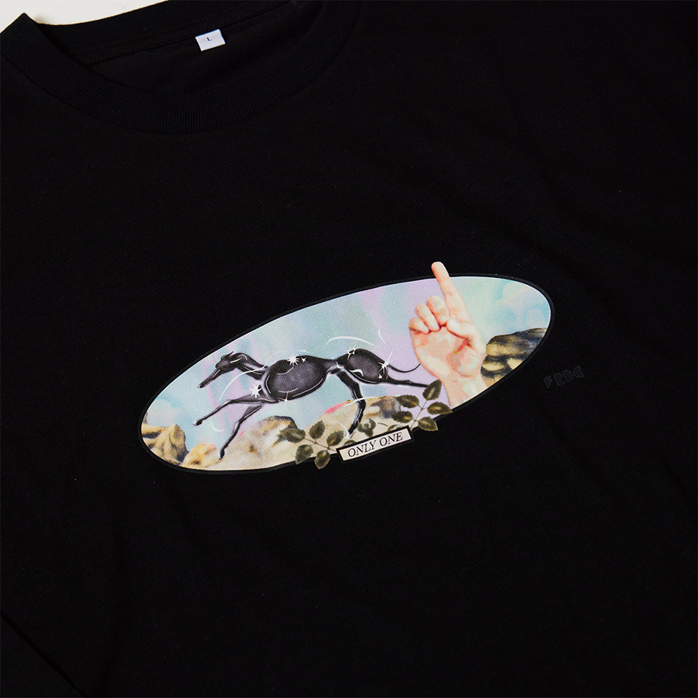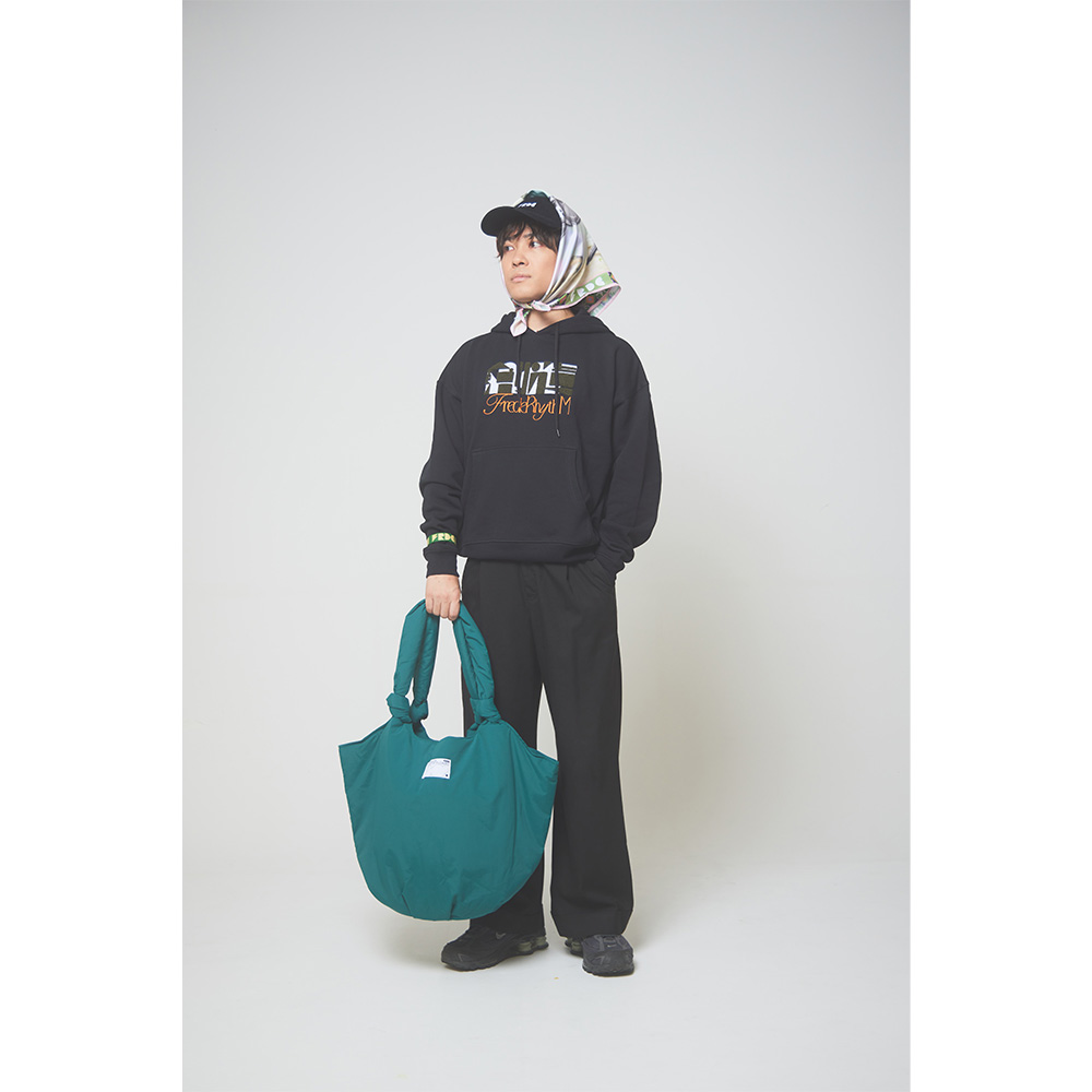 表の刺繍と重なったFRDCのバッグプリントが特徴のTシャツ
